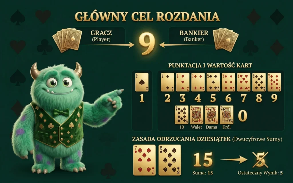 Najciekawszą cechą tej mechaniki jest zasada odrzucania dziesiątek. W tej grze suma na ręce fizycznie nie może przekroczyć dziewiątki. Jeśli po zsumowaniu nominałów otrzymamy liczbę dwucyfrową, pierwsza cyfra po prostu przepada (jest odrzucana). Przeanalizujmy to na przykładzie: krupier rozdaje ci 7 i 8. W sumie daje to 15. Usuwamy pierwszą cyfrę (jedynkę) i twój ostateczny wynik w tej rundzie wynosi 5 punktów.