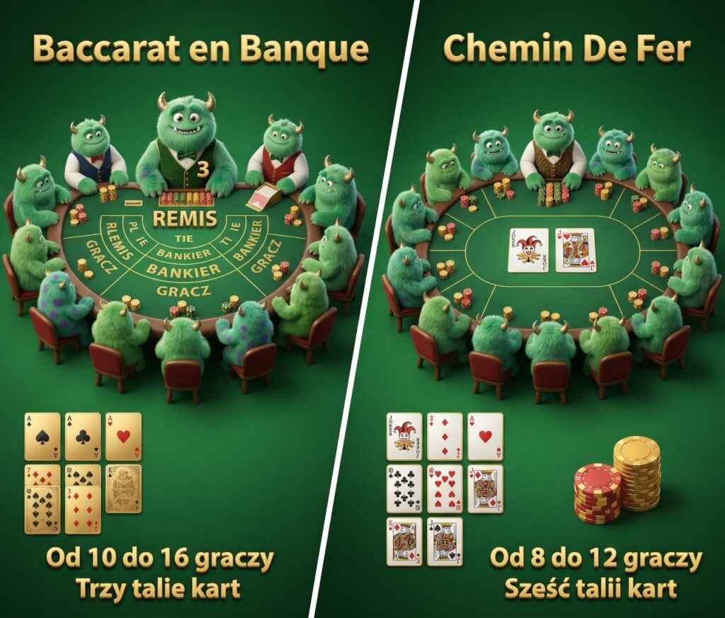 - Chemin de Fer: Klasyczna francuska szkoła, którą uwielbiają high rollerzy. Jej kluczową cechą jest to, że uczestnicy nie grają przeciwko kasynu, ale przeciwko sobie nawzajem. Gracze po kolei wcielają się w rolę bankiera i, co najważniejsze, zyskują prawo do samodzielnego decydowania, czy dobierają trzecią kartę. W standardowych kasynach online spotykana rzadko, najczęściej w ekskluzywnych pokojach VIP.